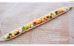 粘土で作るミニチュアスイーツ。ミニチュアケーキを並べたラダーワークブレスレットの制作例をご紹介。フェイクスイーツの可愛さとハンドメイドの魅力を楽しめるアクセサリーです。